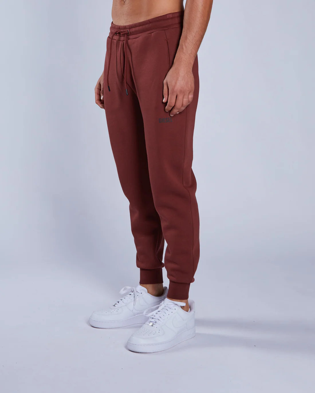 Soft, brushed interior fleece jogger with DIESEL branding at thigh. Details include simple open side pockets and ribbed cuffs at ankle.