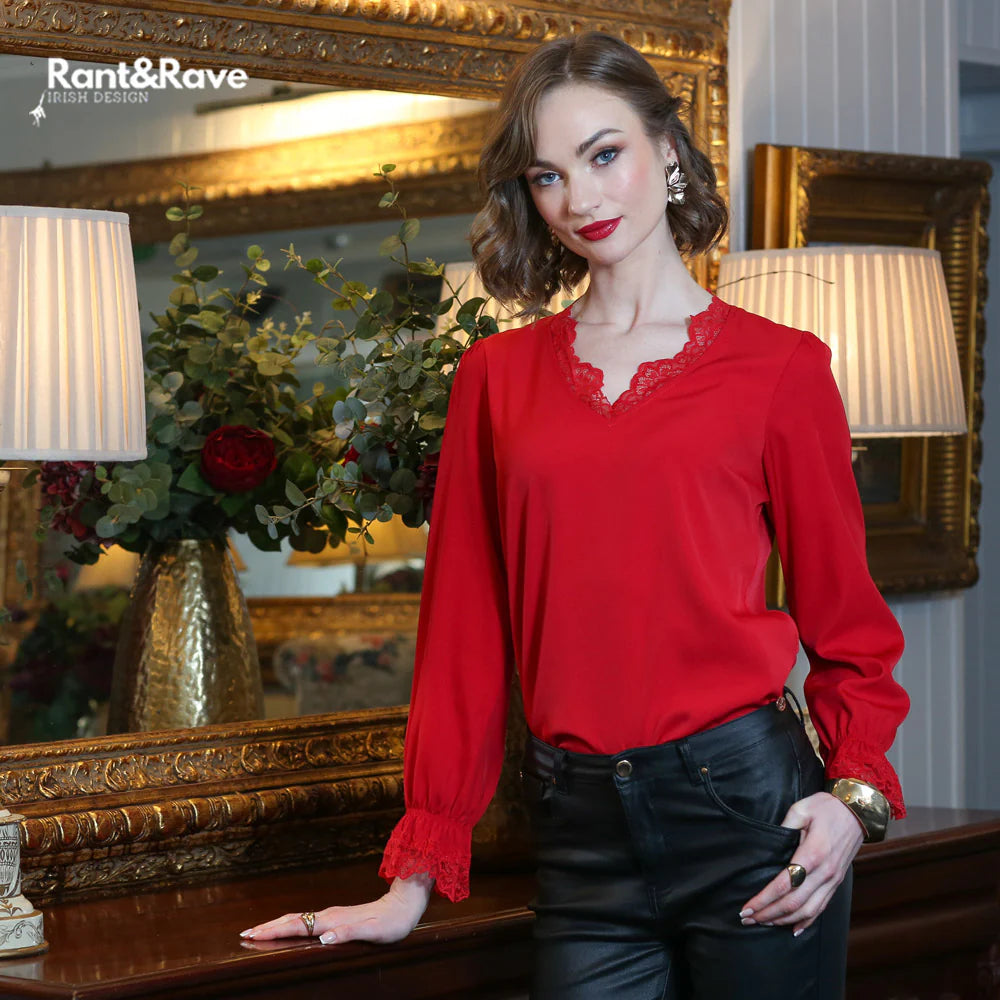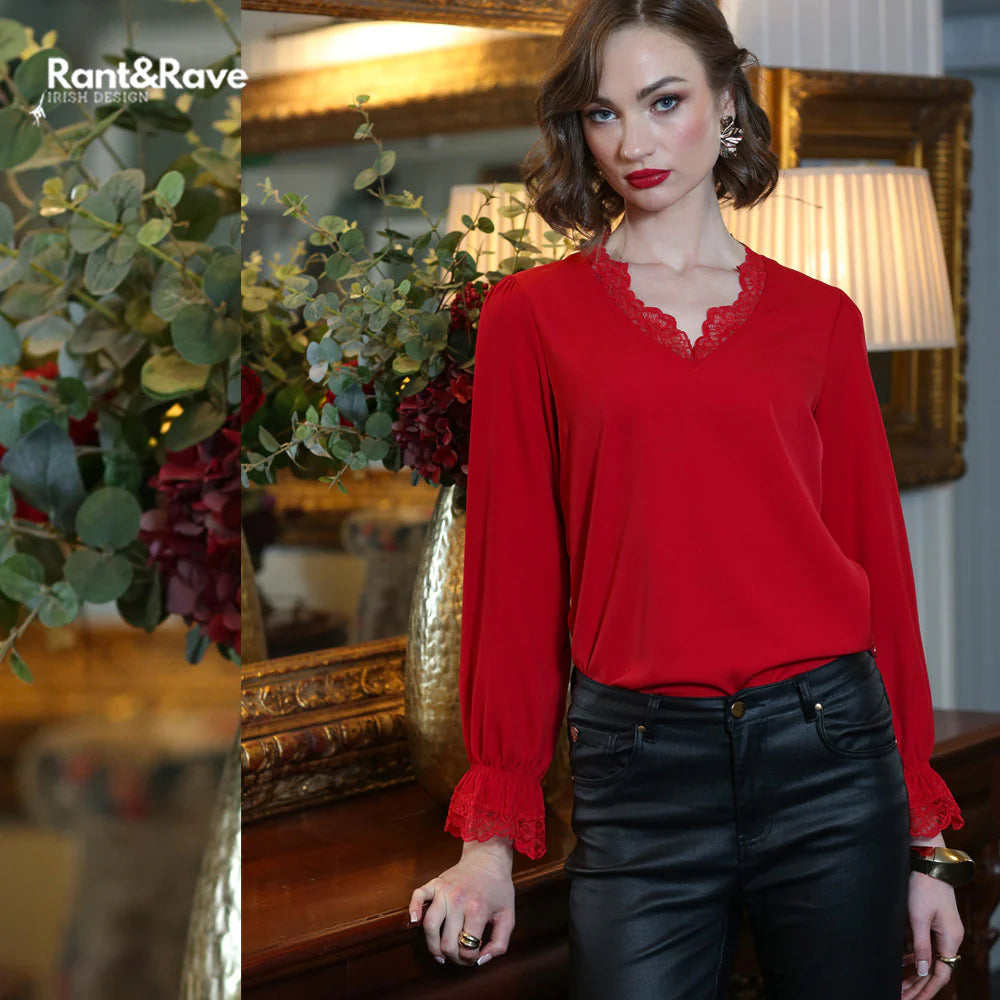 Turn heads in the Rant and Rave Oakley Top in Red, a bold yet elegant piece that adds instant polish to any outfit. Crafted from a silky, fluid fabric, this stunning top features delicate lace trim along the V-neckline and cuffs for a touch of feminine sophistication.